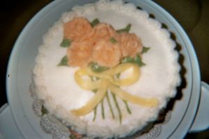 We started out on simple one- tiered cakes. We were taught to split the cake in the middle, put icing all around the rim, and then put the fruit filling in the center. Then cover the cake with icing, (being careful not to spread the crumbs)– just icing, over the cake. Then, we took a piece of parchment paper, and smoothed down the icing. I did okay for my first time. Some people had a crooked mound of icing full of crumbs.