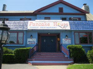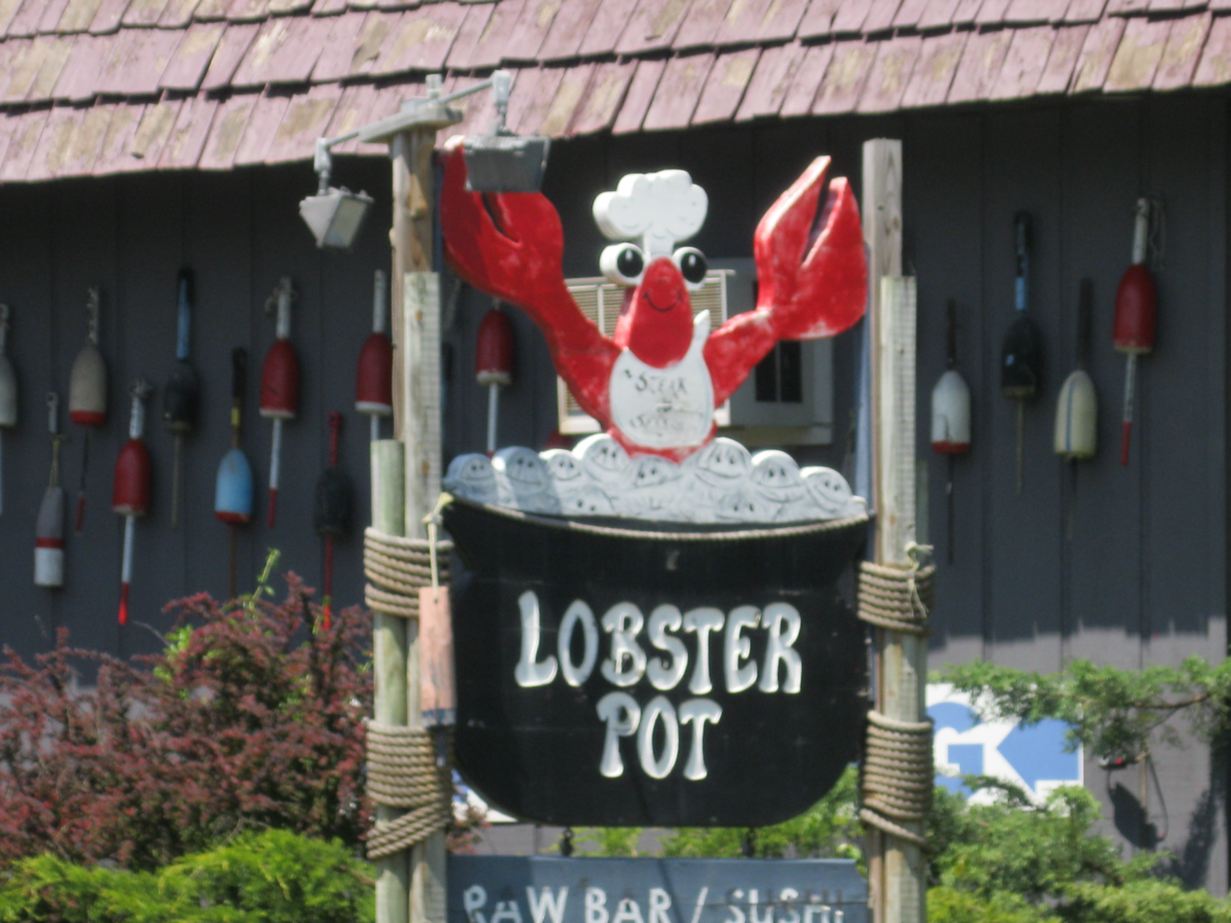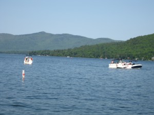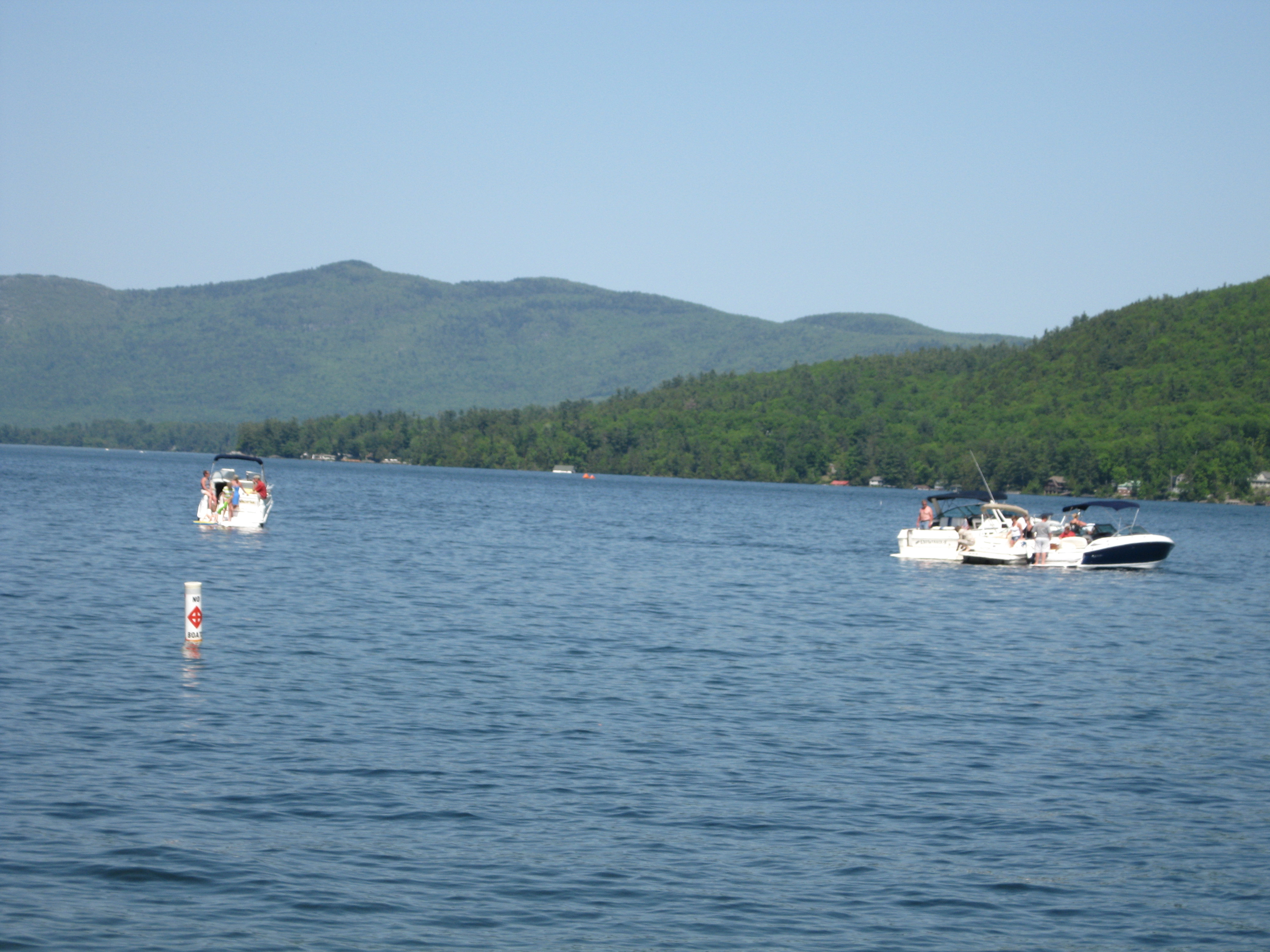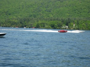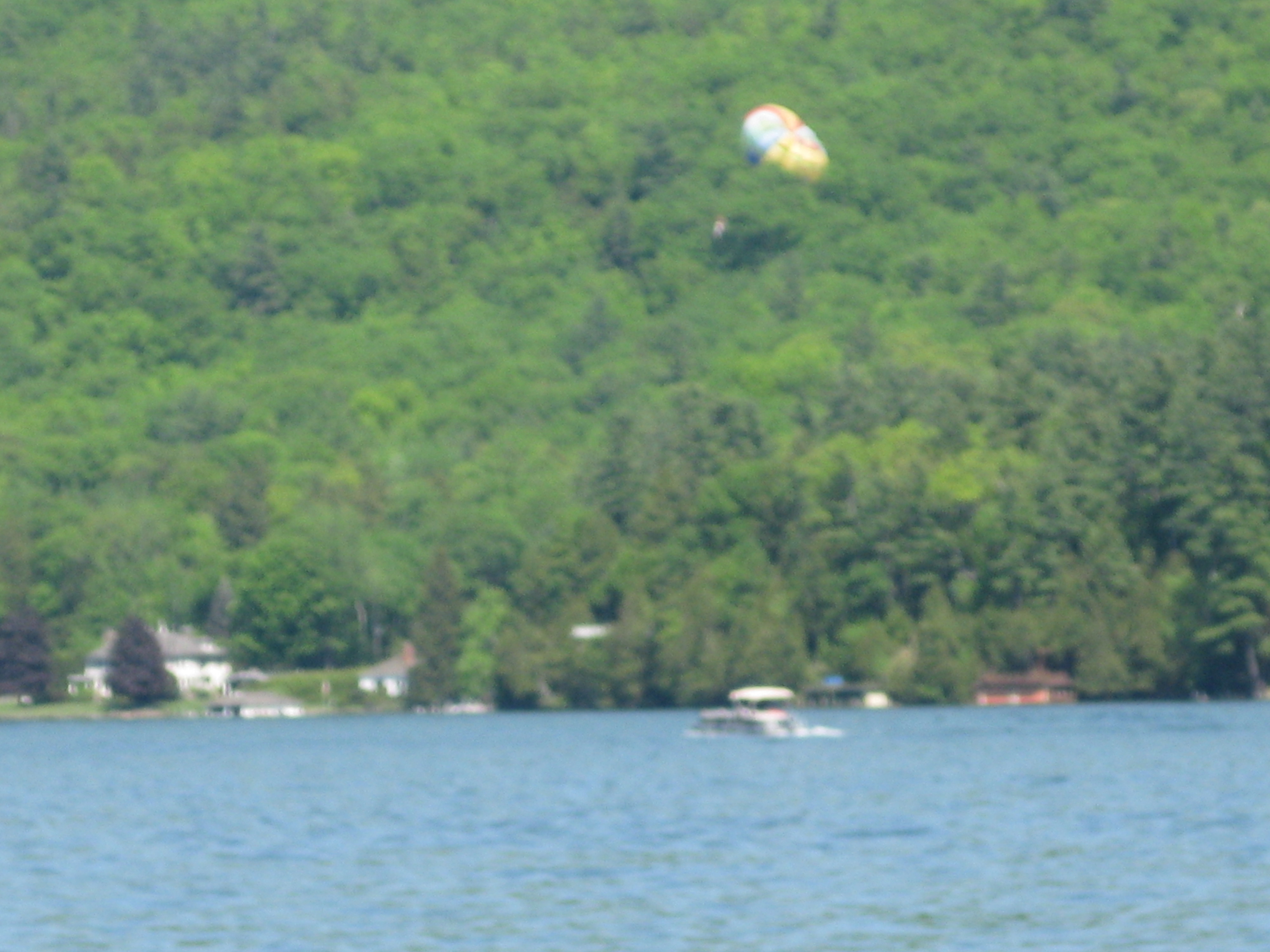 We attempted to go up the hill, to a park, to see the view, but we were stopped!!!We went back into town, and I saw this cute lobster, posing for a picture!“Pancakes House” — we didn’t eat here either… gotta watch my carbs, ya know!OK, down to the Lake itself. Here’s one of the “cruise” boats that frequent the lake.A blurry image of a guy parasailing… he’s much braver than I am!!Some racing boats — that red one sure was fast!More boating — beautiful water — and the moutains–Mama duck and baby ducks.