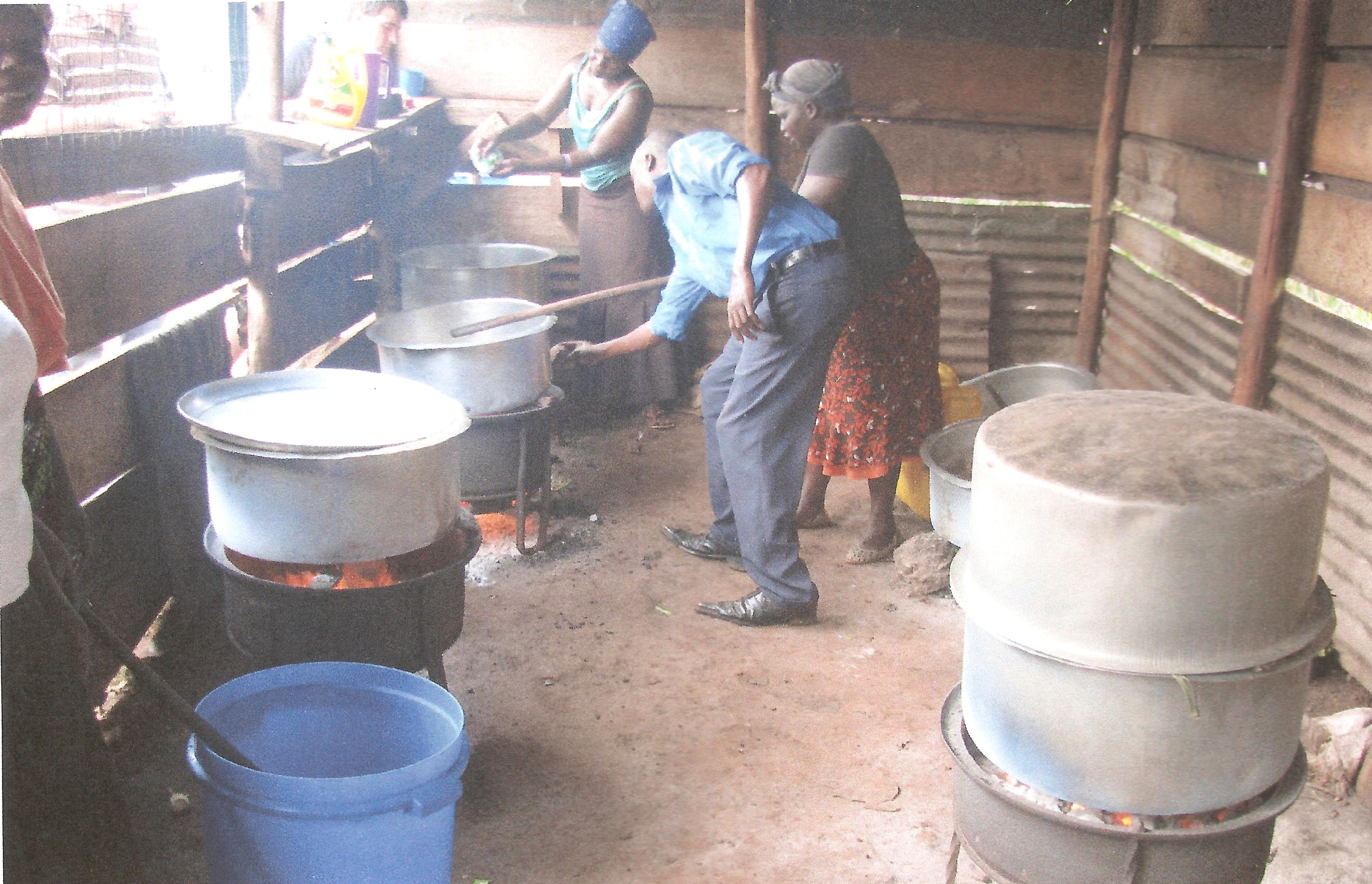 Here is another picture of the cooks in their “kitchen” area. You can see the materials that make up the building, such as the aluminum walls. Also notice the large cooking vessels. That’s a lot of meals!