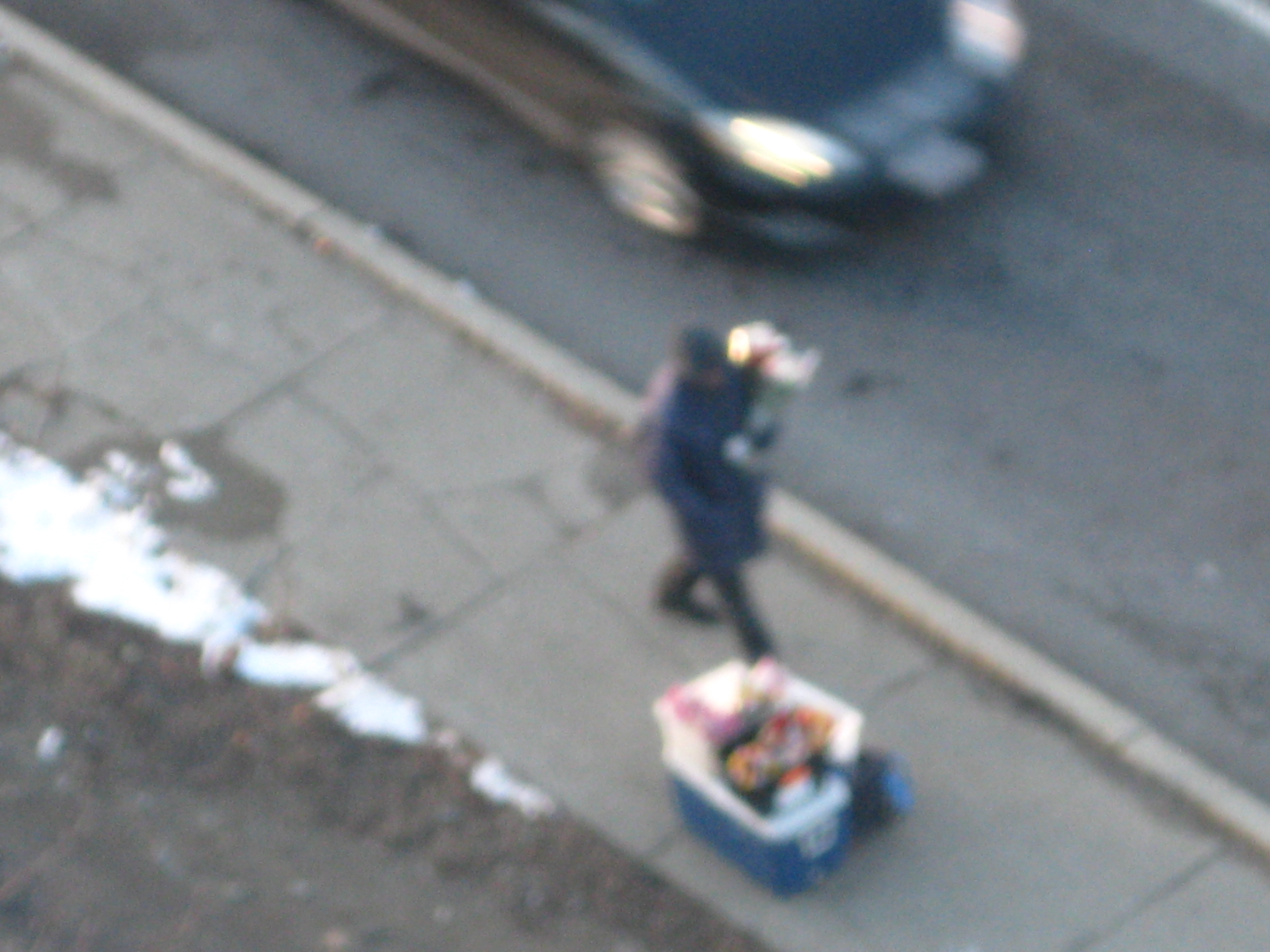 I sat in my warm hotel room watching the scene going on. I tried to figure out how to get over to him to buy some flowers. I wanted to encourage him. I grabbed a $20 bill and my sweater and went down to the lobby to try to figure out how to get to him.