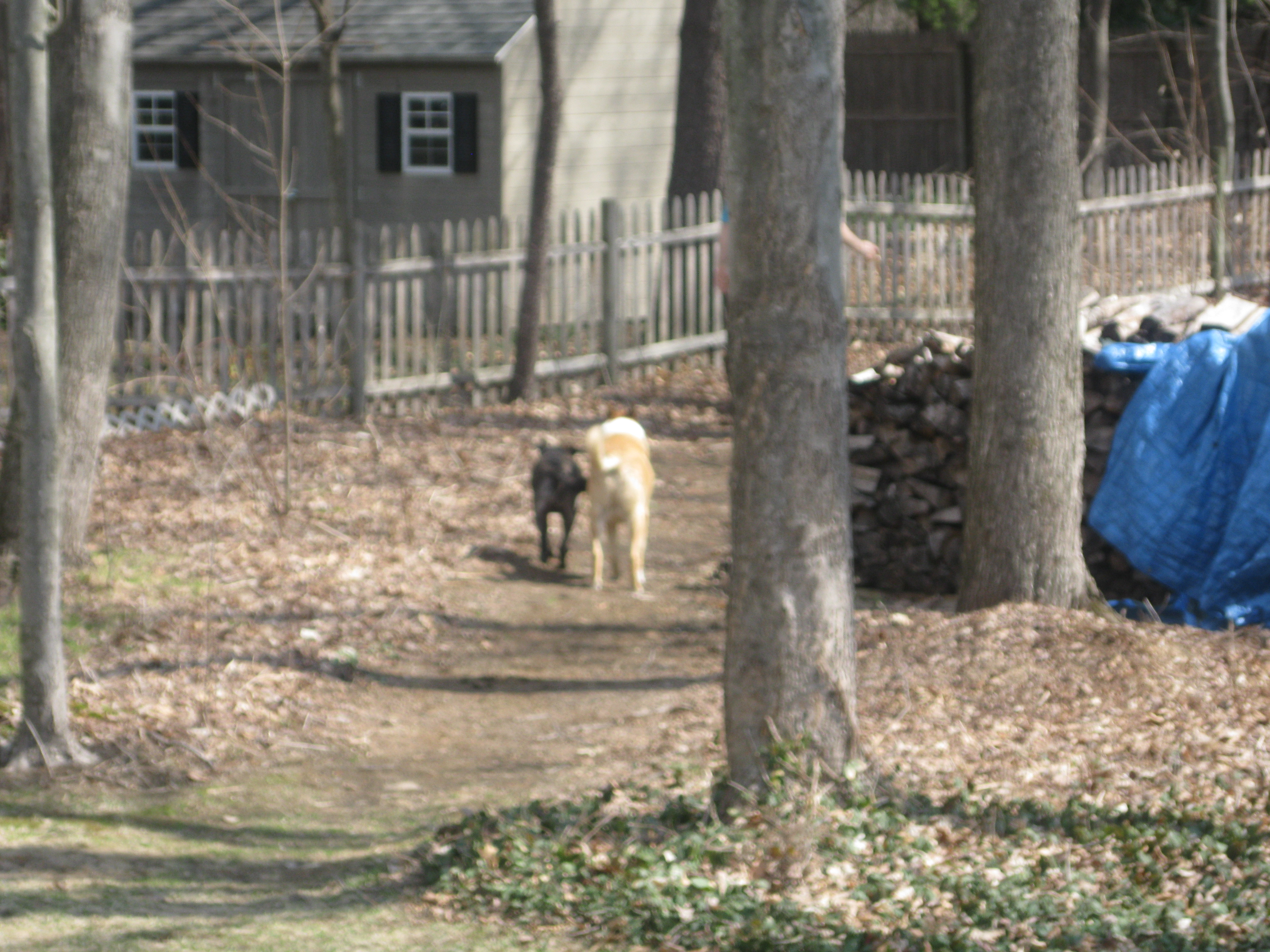 This is a picture of Blitz and me running on the path into the woods. I am the fastest runner, so sometimes I slow down so Blitz can catch up with me.