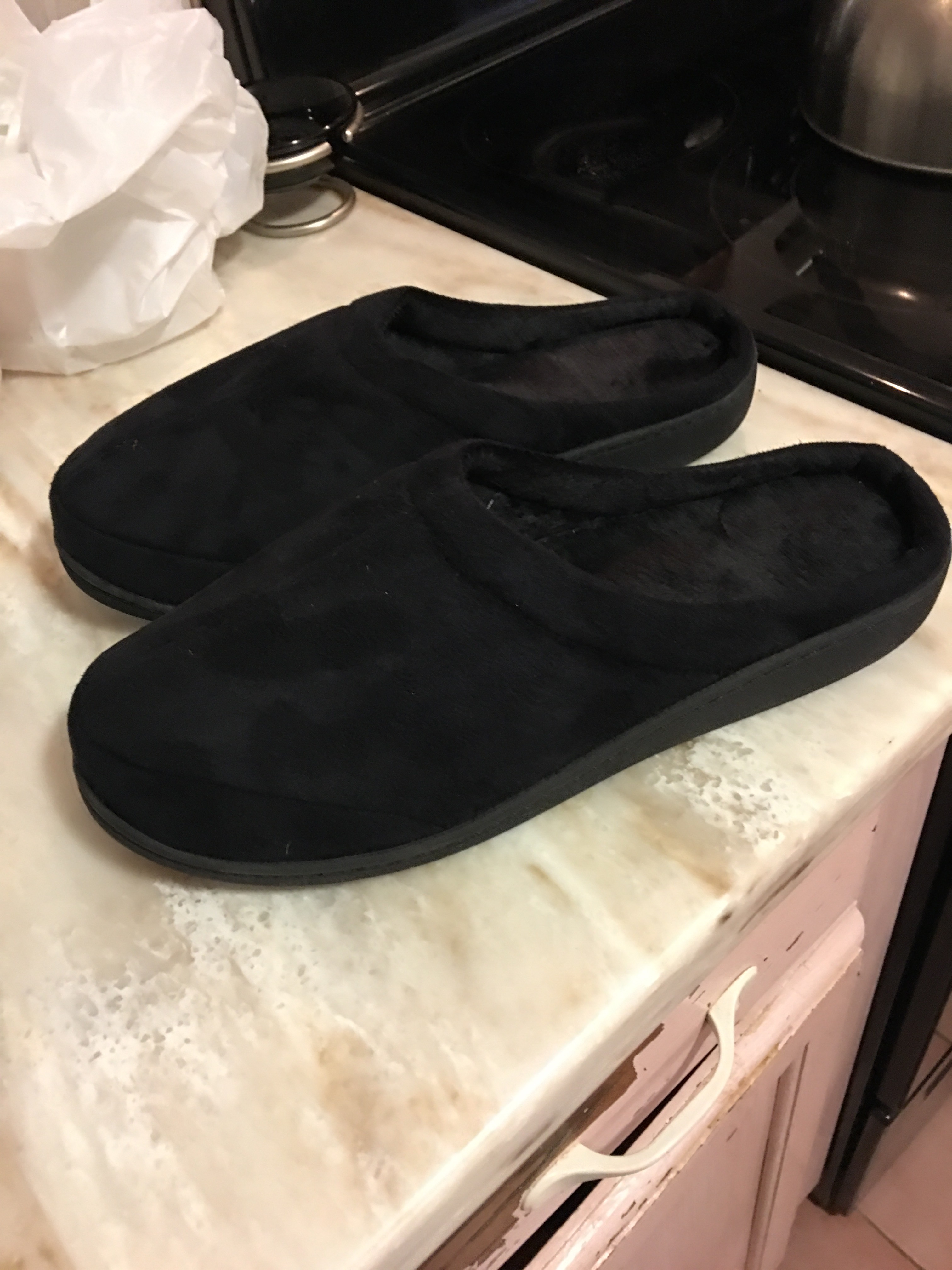 I suppose I could have “cropped ” the photo, so only my slippers are there. Instead, you can see my still-pink cabinets, and a miscellaneous plastic bag. Inside that bag are apples from a local orchard. Delish. I already made a dish of pseudo-apple crisp (no flour, no added sugar) and it was delicious. The big secret: cinnamon and nutmeg. What, you already knew that?!