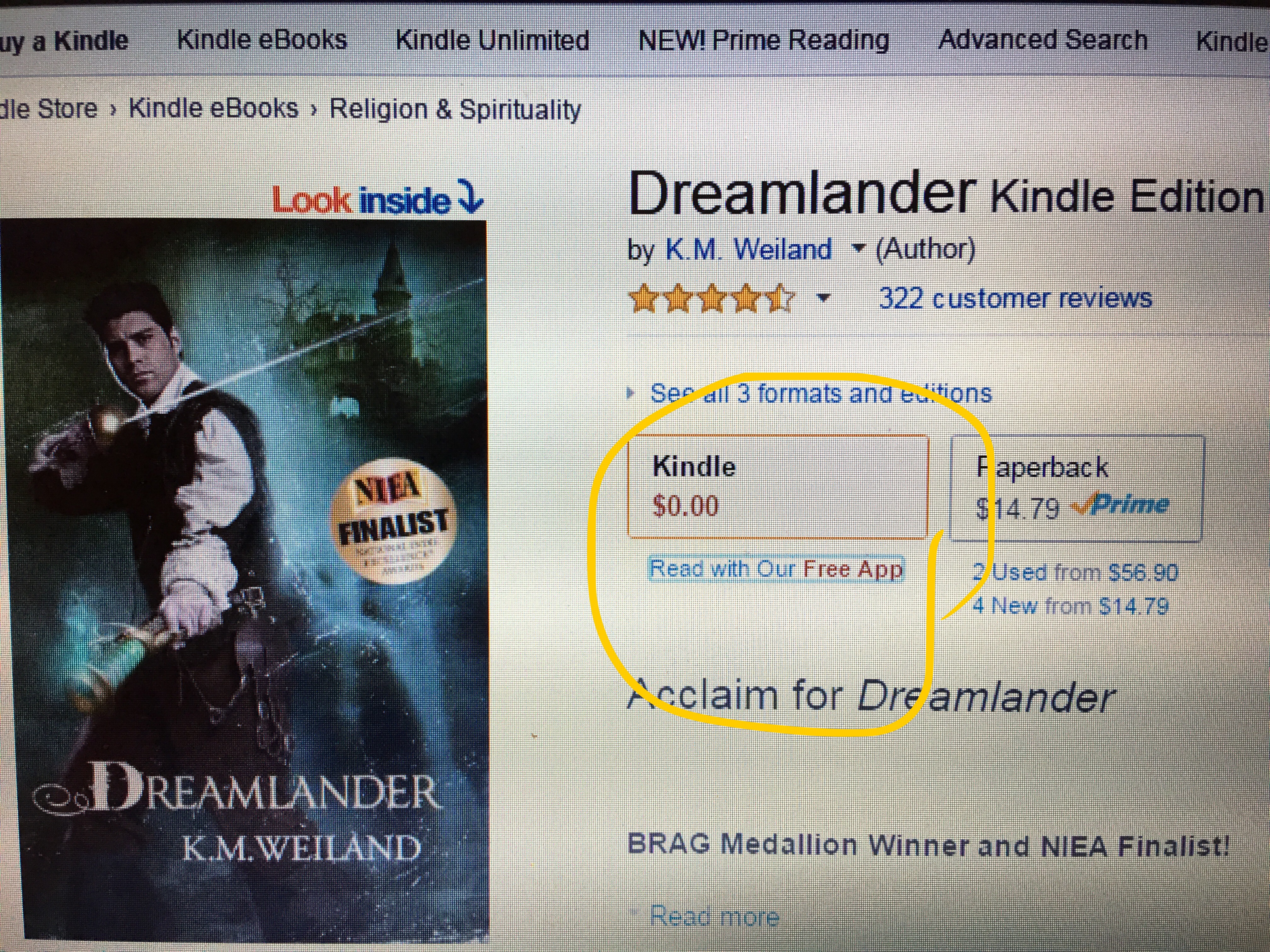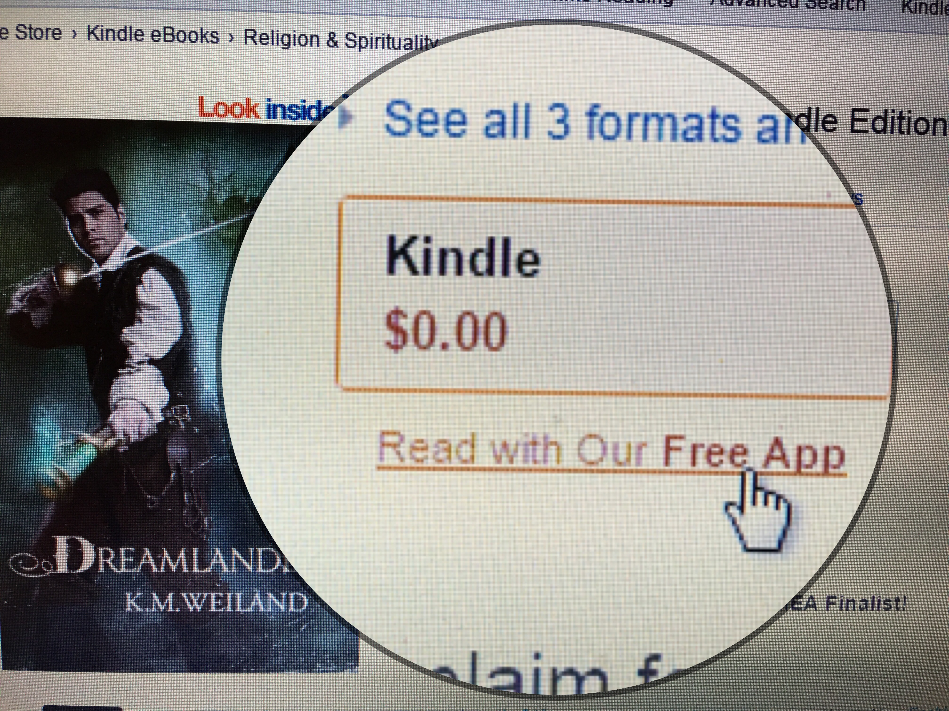 As I have crudely circled in yellow, Kindle price is 0.00. Right under that box says “Read with our free App.”