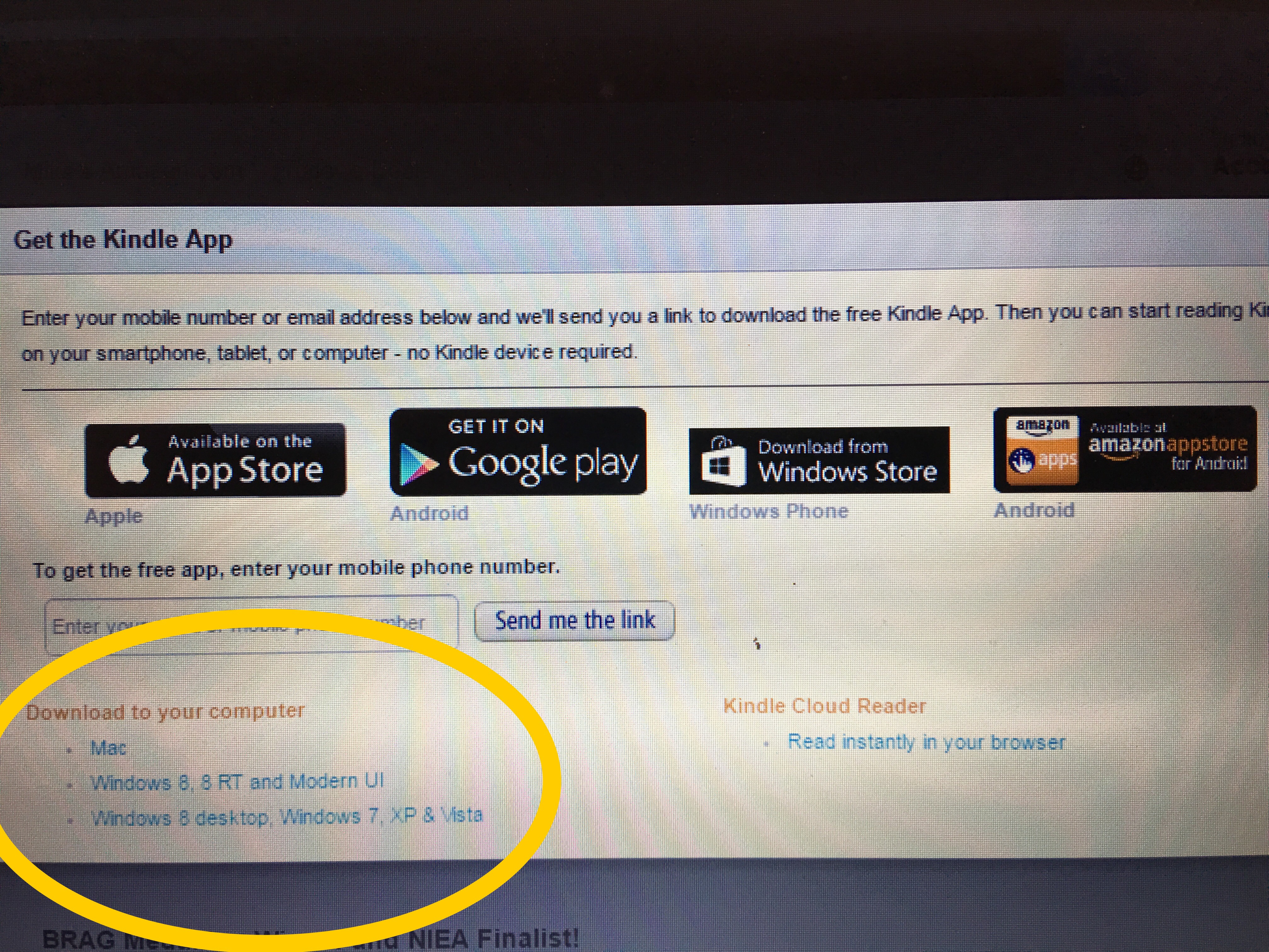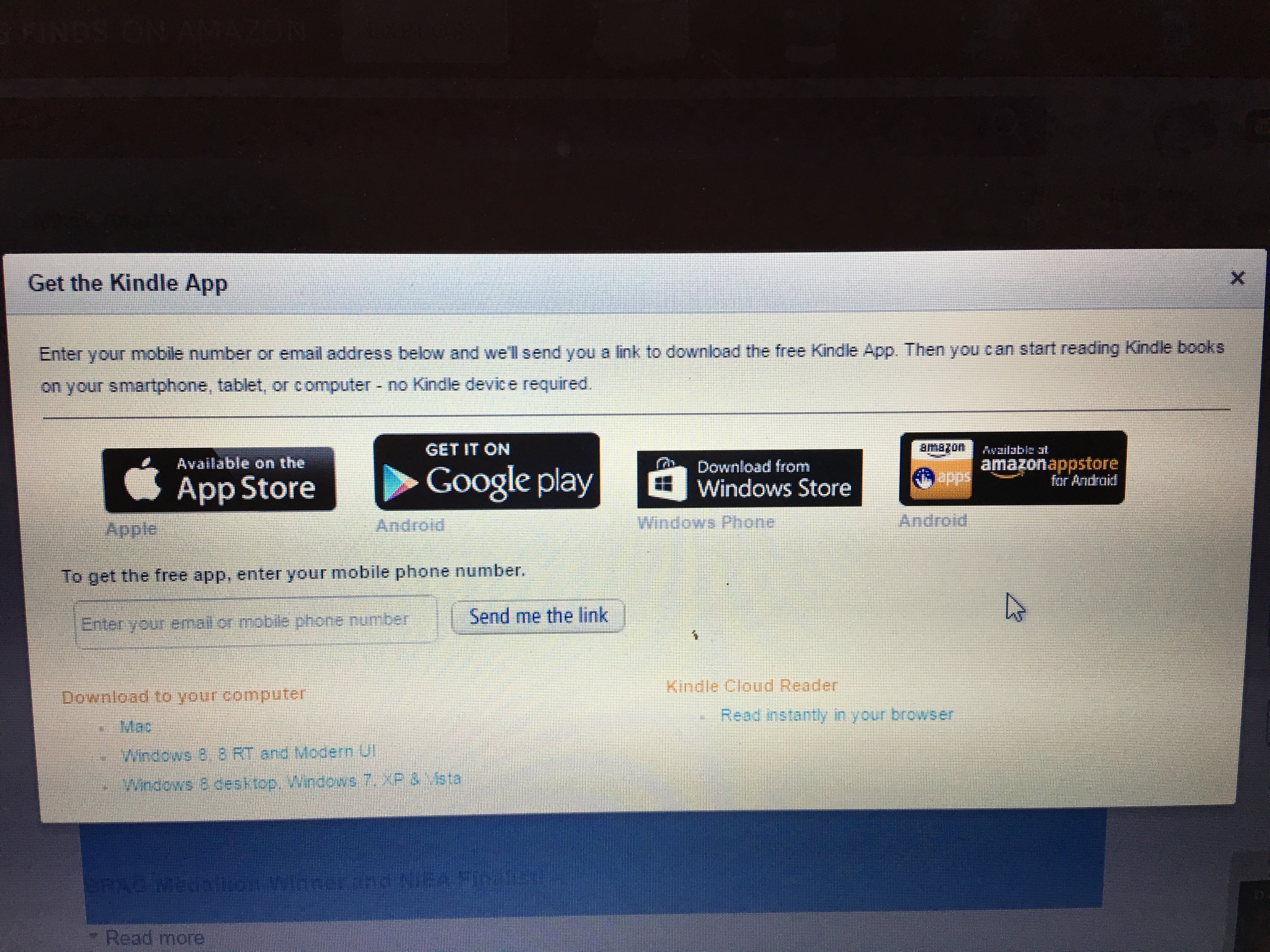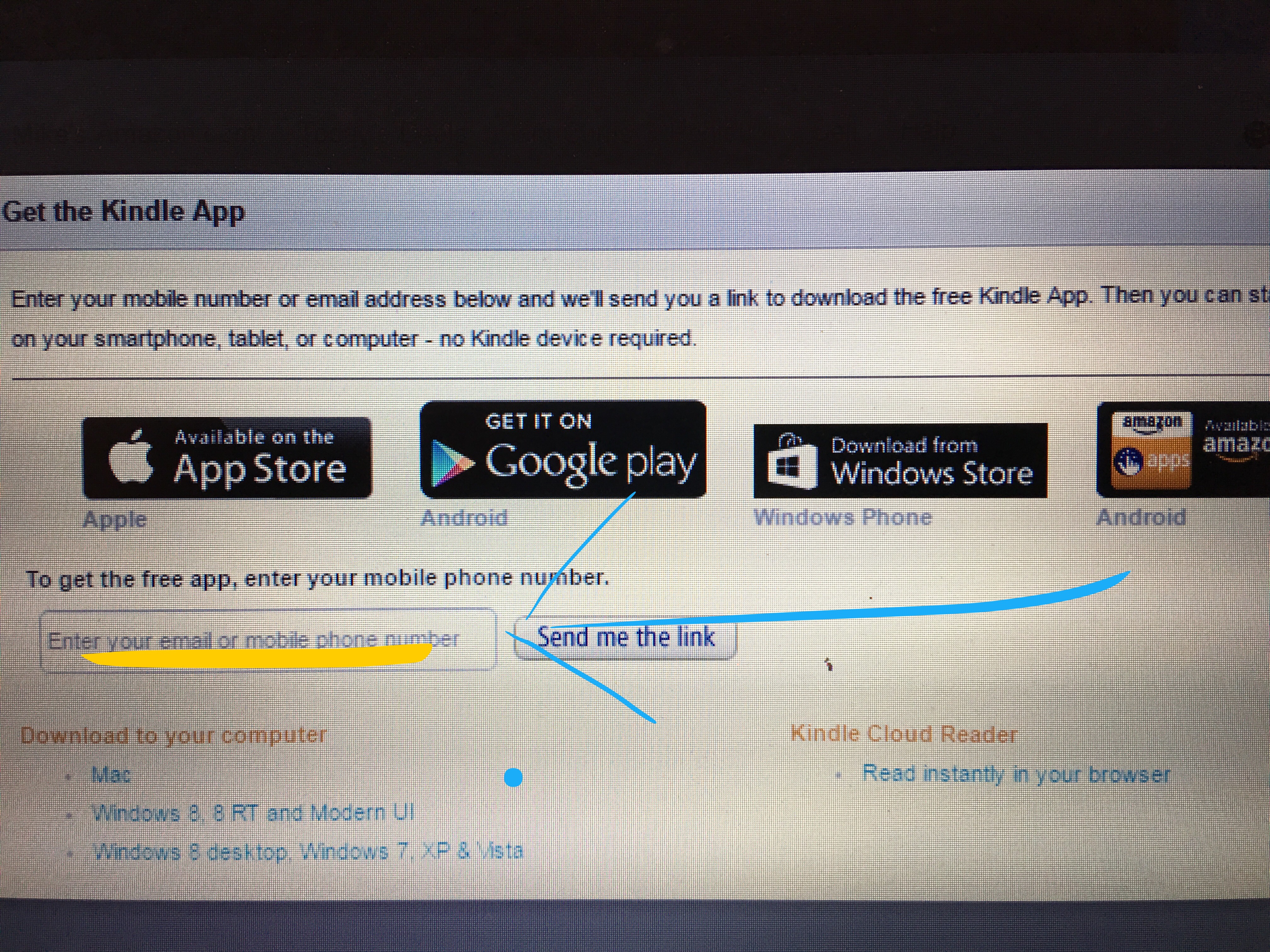 At the very top of the page it says “Get the Kindle App”. The following line says to enter your phone number or email address. Then a link will be sent to you to download the app.
