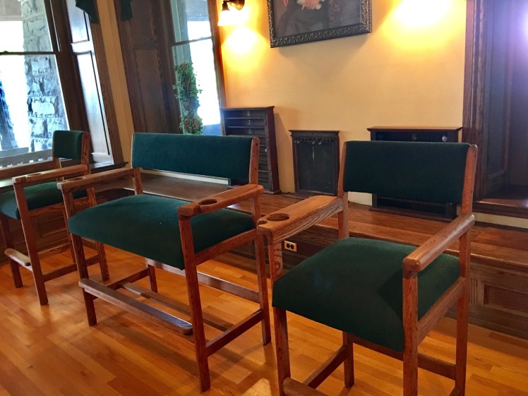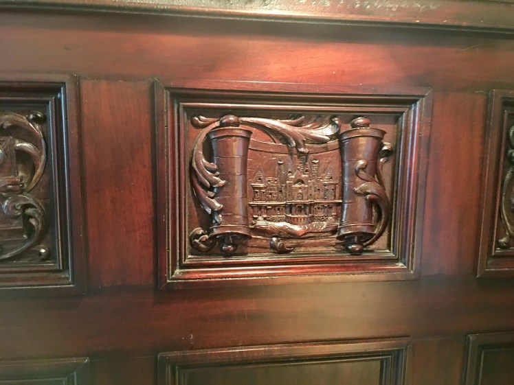 Wood inlay on the walls. Chairs for guests with drink-holders carved into the arm rests.