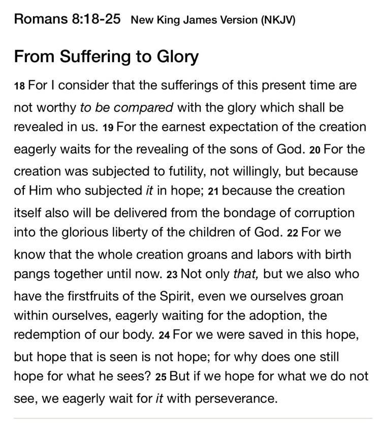 The earth, the creation, is in birth pangs, awaiting the revealing of the sons and daughters of God.