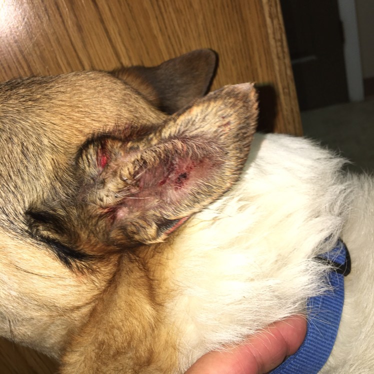 The dog ran out, and growled. Bailey growled back, but then the dog got a hold of Bailey’s ear and would not let go. I tried to pull the dog off, yelling “HELLLP HELLP” until finally the dog let go, and I found myself holding the dog by his collar.