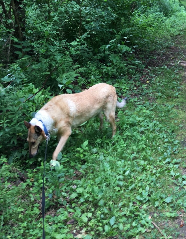 Today we were able to go to the trails at the park. There are lots of smells there from rabbits, people, and other dogs.