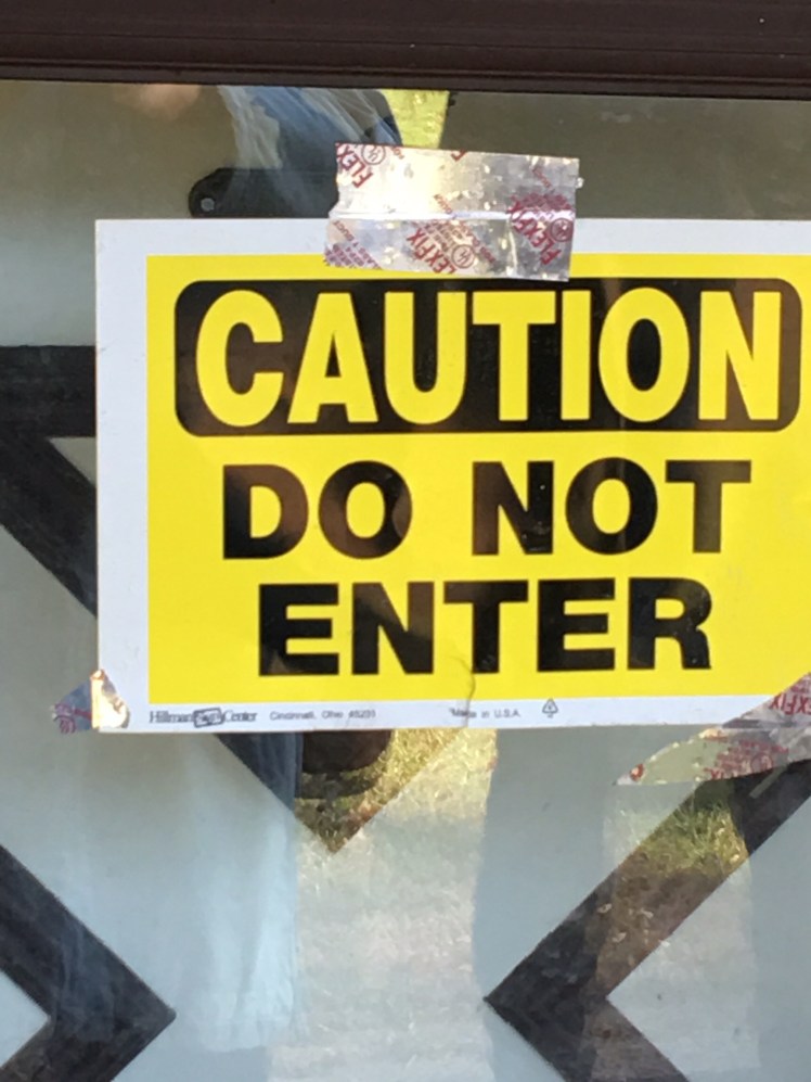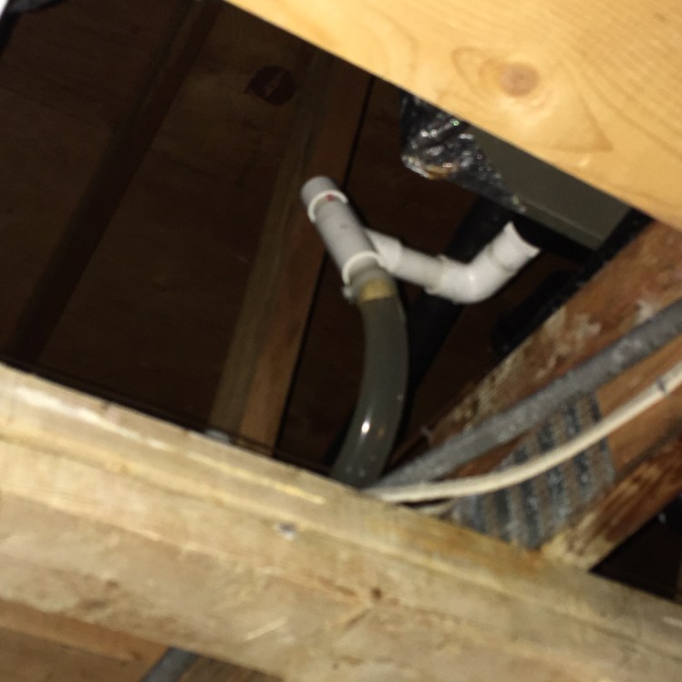 During July–that three week stretch of heat and humidity–the air conditioning condenser sweated and created tons of water. The small”catch bin” had a drain on the left side. But underneath that was the large catch bin. The connectors of the large bin melted during July, sending the large bin to the right. And so it goes, the water came through our ceiling, onto the carpet in the hall, and into the inside walls of the kitchen. Incidentally the “fail safe” switch had never been installed, it was just sitting nearby.
