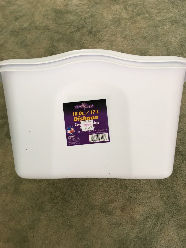 So. I had to go buy a dishpan. It’s only 3 bucks but I had to find a store that actually sells them! I went to three stores before I successfully found them at Job Lot.